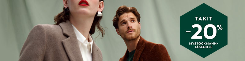 MyStockmann-jäsenenä tai jäseneksi liittyvänä saat 20 %:n edun laajasta valikoimasta normaalihintaisia naisten ja miesten ulkotakkeja sekä lasten takkeja ja haalareita torstaista 23.10. sunnuntaihin 26.10.2025. Etu on voimassa verkkokaupassa ja Suomen tavarataloissa. Etu on voimassa tuotteissa, joiden tiedoissa näkyy tunnus ”Jäsenetu –20 %”.