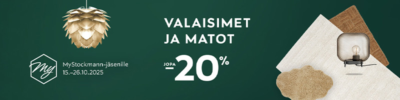 MyStockmann-jäsenenä tai jäseneksi liittyvänä saat 20 %:n edun normaalihintaisista matoista ja valaisimista. Etu on voimassa ajalla 15.–26.10. 2025 verkkokaupassa ja tavarataloissa.