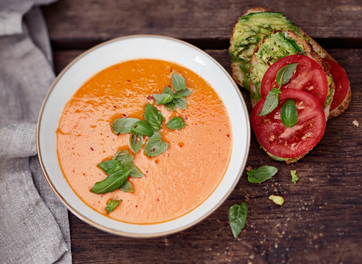 5. Viimeistele keitto ja leivät basilikan lehdillä. Tarjoile keitto avokadoleipien kanssa.