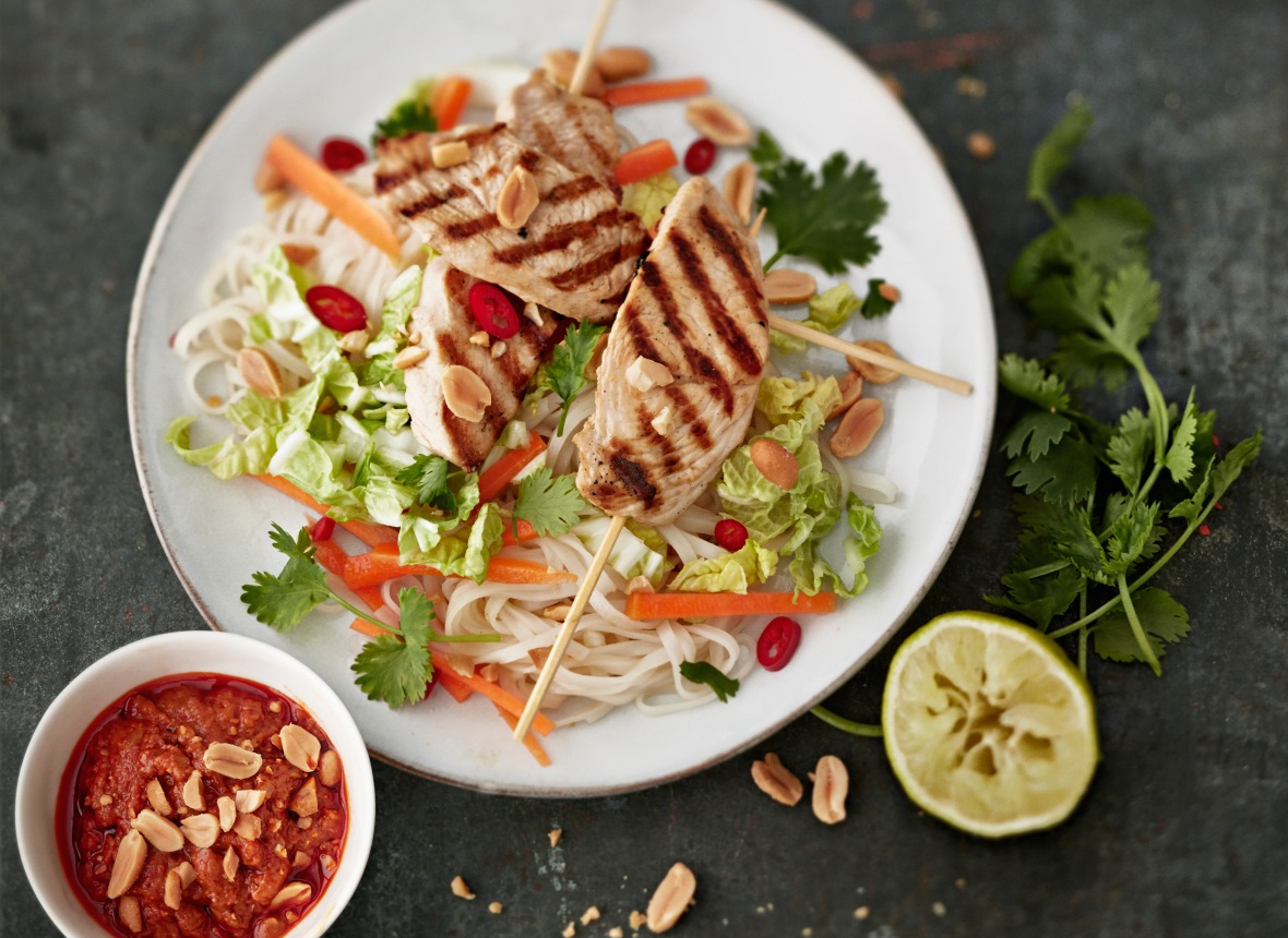 3. Paahda/grillaa kalkkunavartaat kypsiksi ja tarjoa sataykastikkeen ja thaisalaatin kanssa.